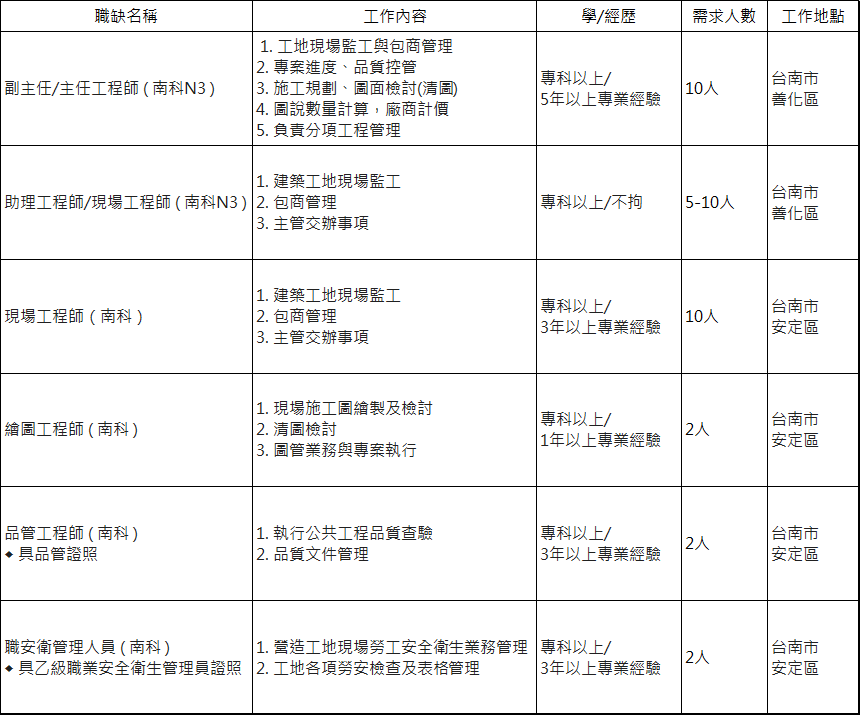 [tw] 【根基營造】台南台積電工程之人力需求 【根基營造】台南台積電工程之人力需求 因應台南台積電工程急迫,目前急需大量人力,請參閱下表。詳細工作內容,可請同學參閱104職缺。 分享文章 : 文章發佈日期 : 2019-12-26