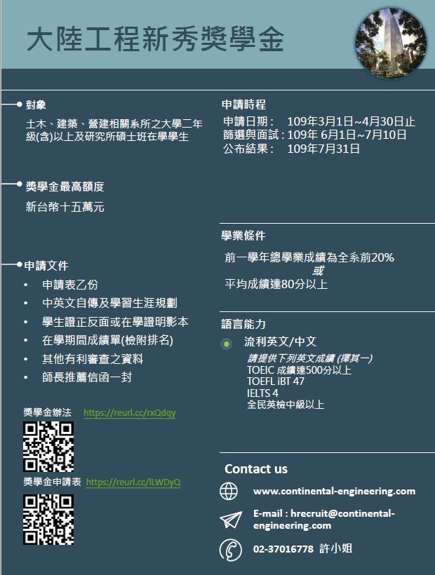 [tw] 2020年大陸工程校園合作計畫及實習生宣傳EDM 備註:目前無多益成績但學業成績符合的同學,可先提出申請,大陸工程會擇期邀請至總公司進行英文測驗即可。 分享文章 : 文章發佈日期 : 2020-04-08