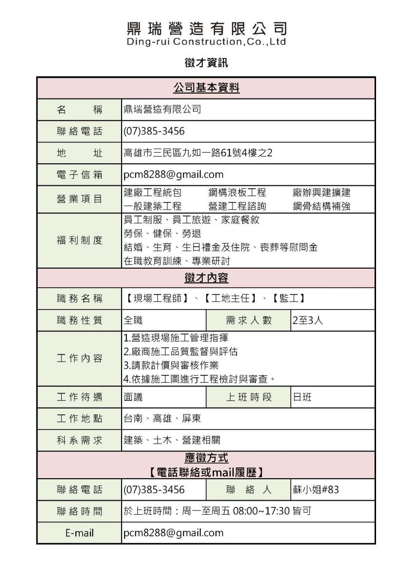 鼎瑞營造有限公司-徵才資訊