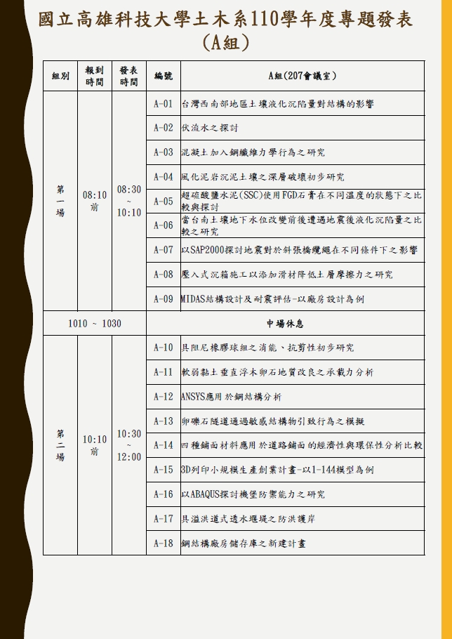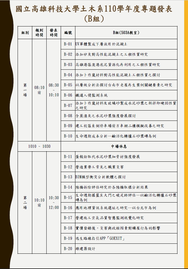 四、發表形式:正式競賽時分為A(結構/大地)、B(材料/營管)兩組,於不同場地同時進行,一場1.5小時。報告以簡報形式發表(以PPT檔呈現專題內容),每組上台報告8分鐘,評審委員講評2分鐘,現場亦張貼各組海報供委員參考提問。