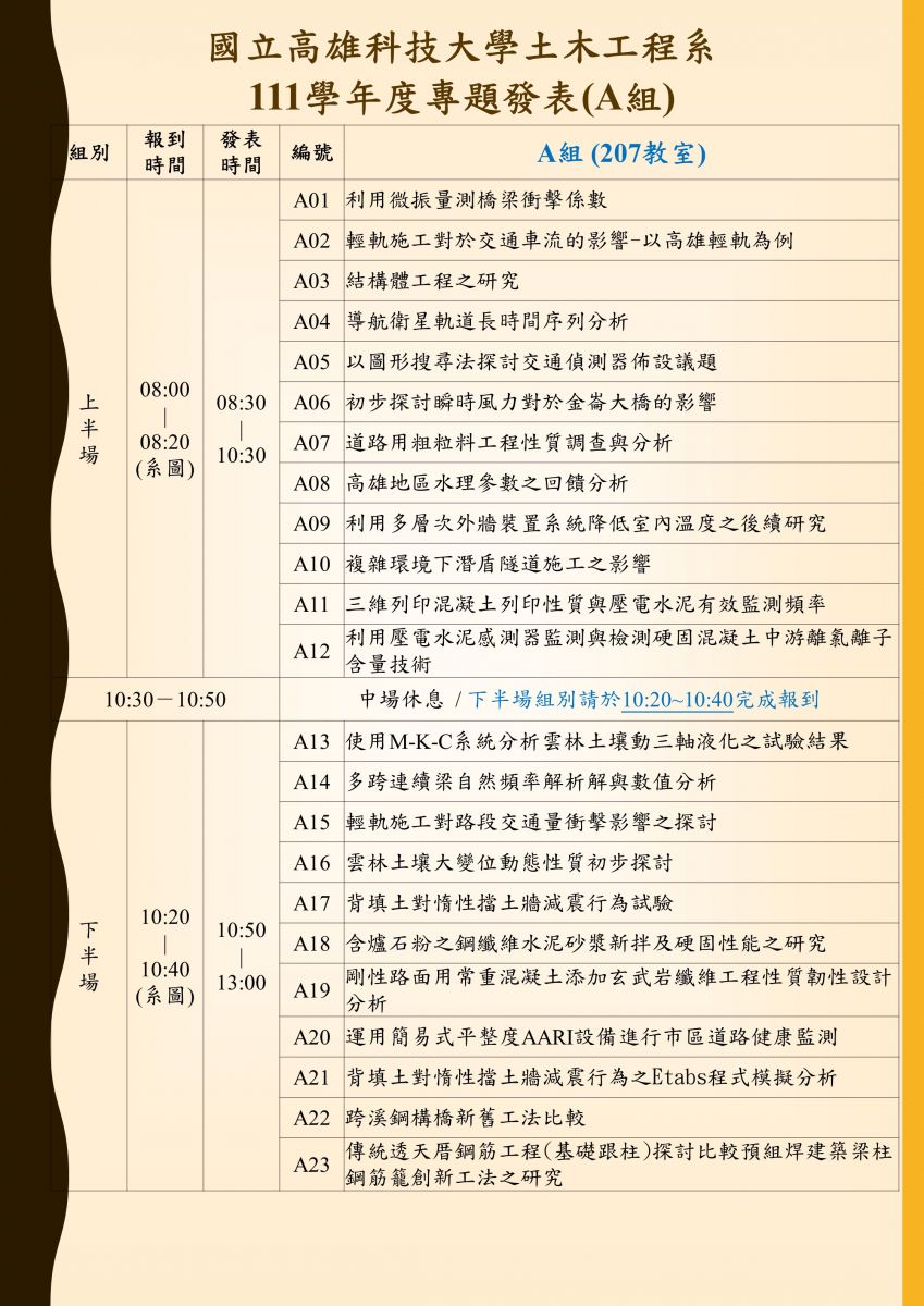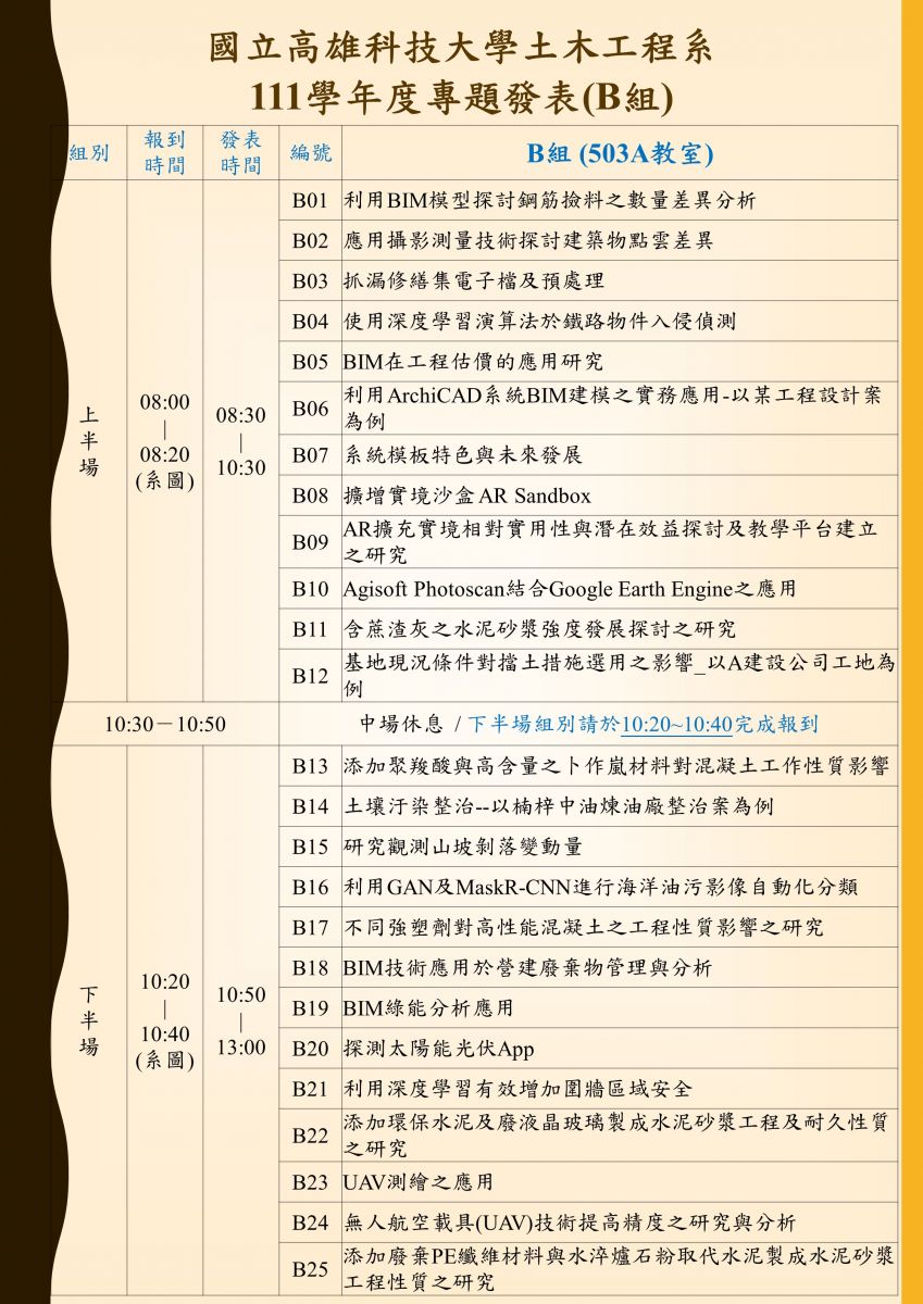 五、發表形式:正式競賽分為A(結構/大地)、B(材料/營管)兩組,於不同場地同時進行,一場2小時。報告以簡報形式發表(以PPT檔呈現專題內容),每組上台報告8分鐘,評審委員講評2分鐘,現場亦張貼各組海報供評審參考提問。