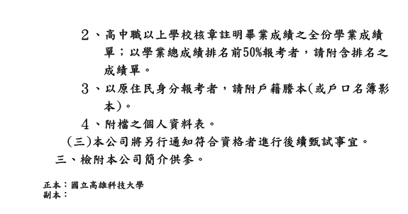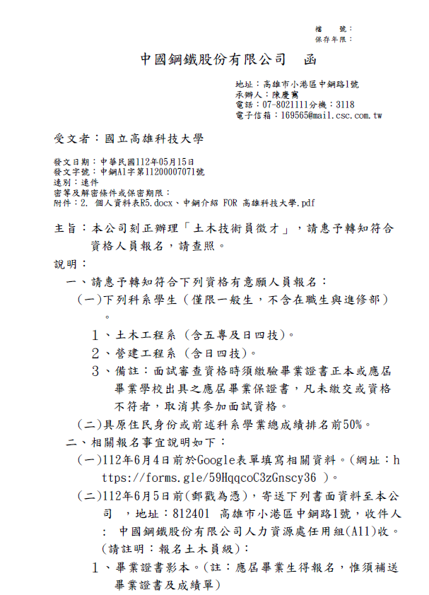 [tw] 中國鋼鐵股份有限公司土木技術員徵才。 【附件】: [附件一]中鋼A1字第11200007071號(高科大).pdf 【附件】: [附表]個人資料表.docx 【附件】: 專招進用介紹.pptx google表單 分享文章 : 文章發佈日期 : 2023-05-26