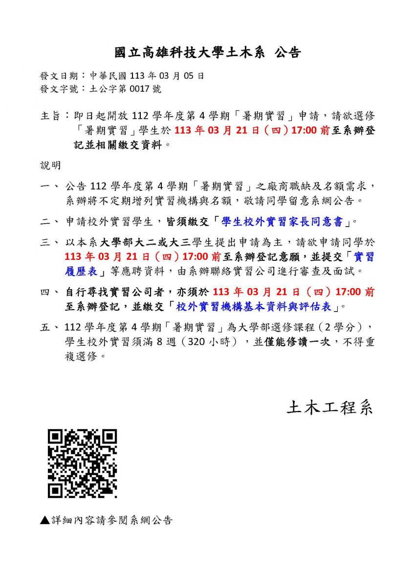 112學年度第4學期欲暑期實習同學請於113年03月21日(四)17:00前至系辦登記並繳交申請資料。