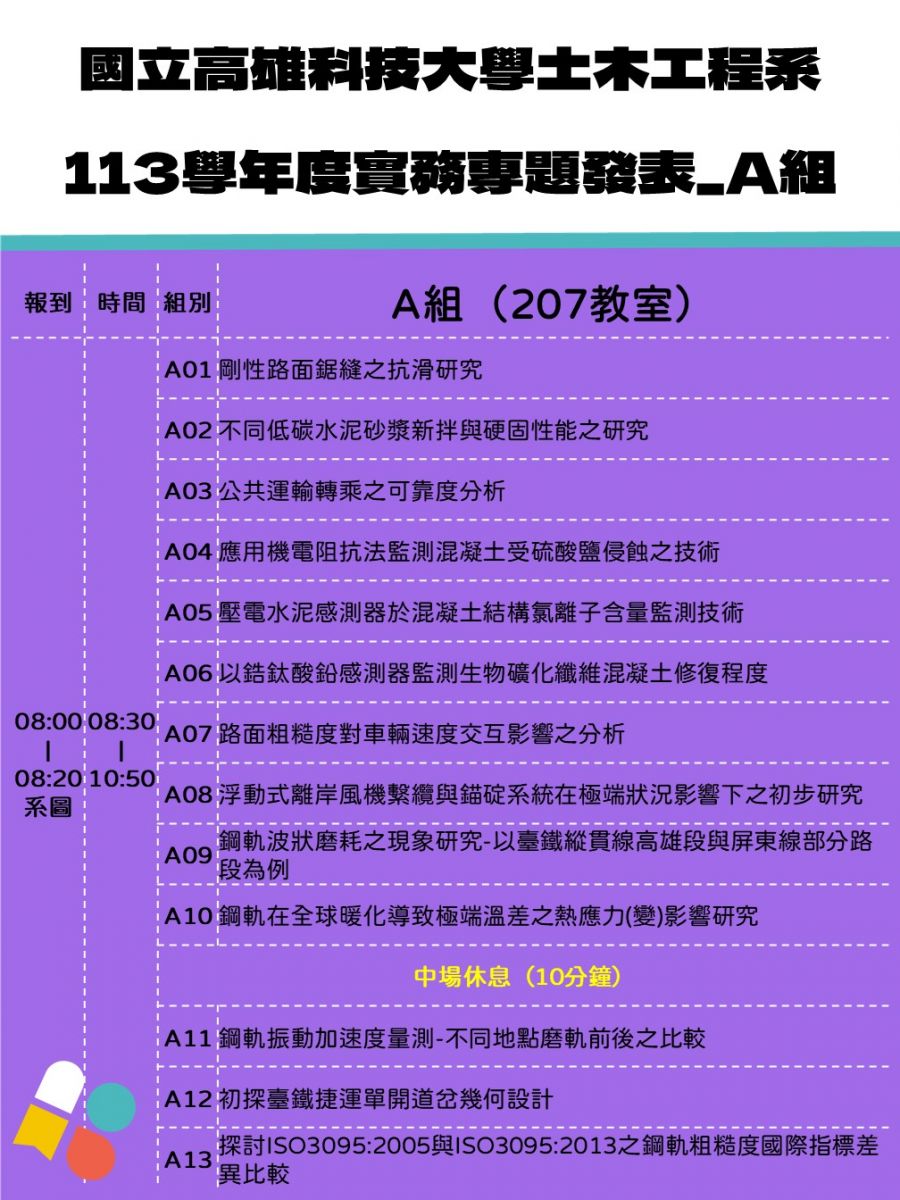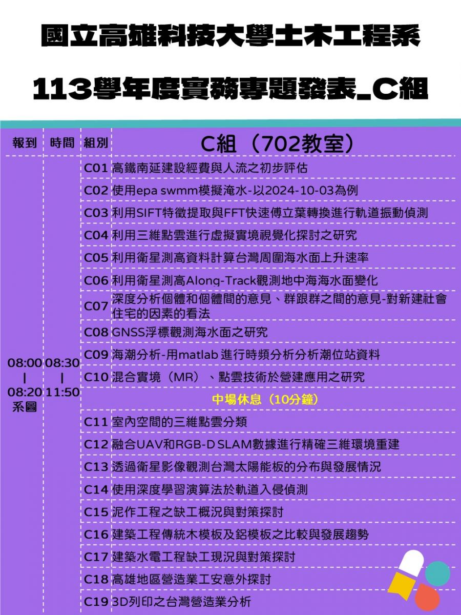 - 各組依序上台口頭報告,學生以簡報形式發表(簡報檔呈現專題內容)後,由評委提問並評分。每組上台報告8分鐘,評審委員講評2分鐘,現場張貼各組海報供評審參考提問。