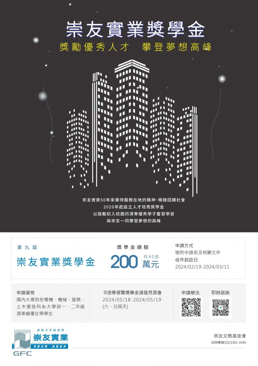崇友文教基金會「崇友實業獎學金」獎學金。